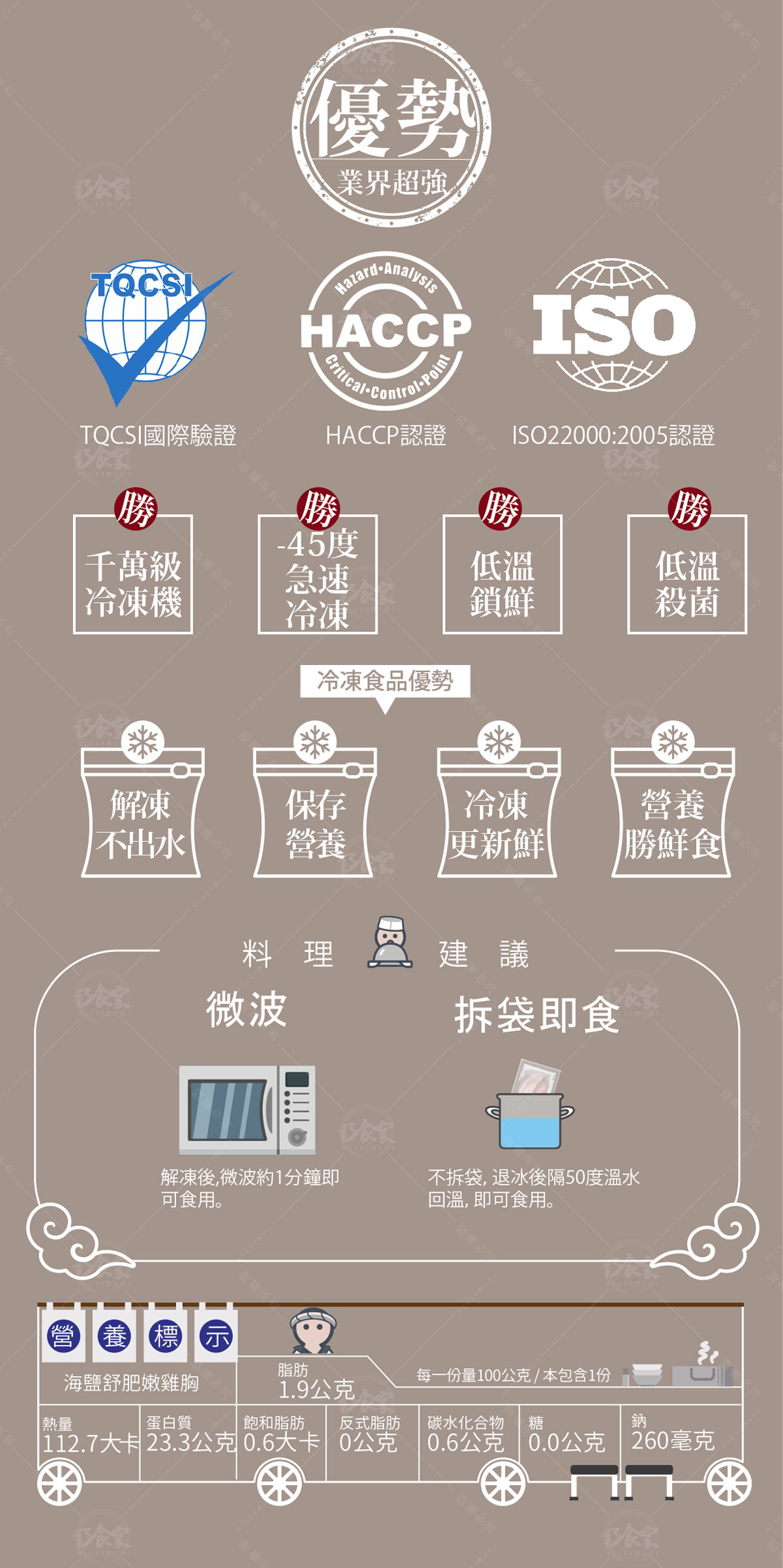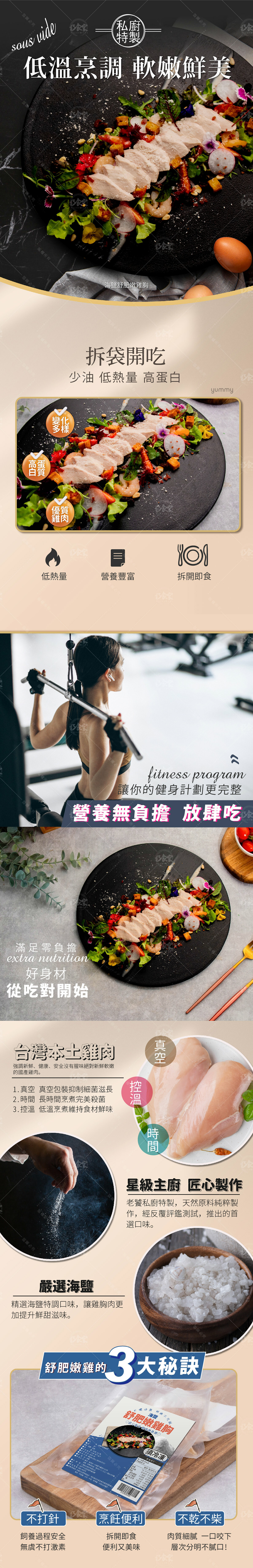 嚴選台灣本土雞肉,軟嫩無腥味,搭配私廚特選海鹽、米酒提味,帶出清爽鮮甜的好滋味,適用多種料理,絕對是輕食的極佳選擇!少油、低熱量、高蛋白,拆封即可食用,隨時補充超便利!