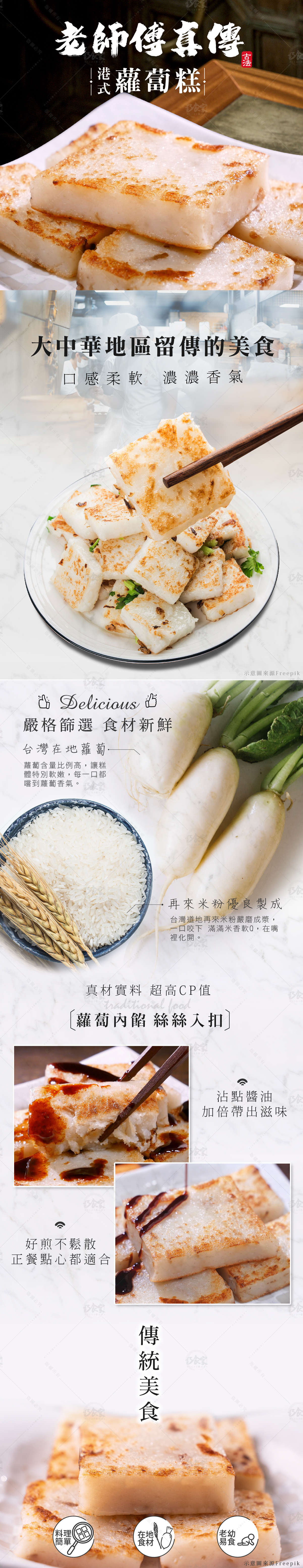 嚴選新鮮白蘿蔔製成,呈現最自然、原始的美味!蘿蔔糕已經切片處理,可直接下鍋煎,省時又方便。簡單料理即能享受外酥內軟、香氣十足的好滋味,是早餐、消夜、點心的極佳選擇!