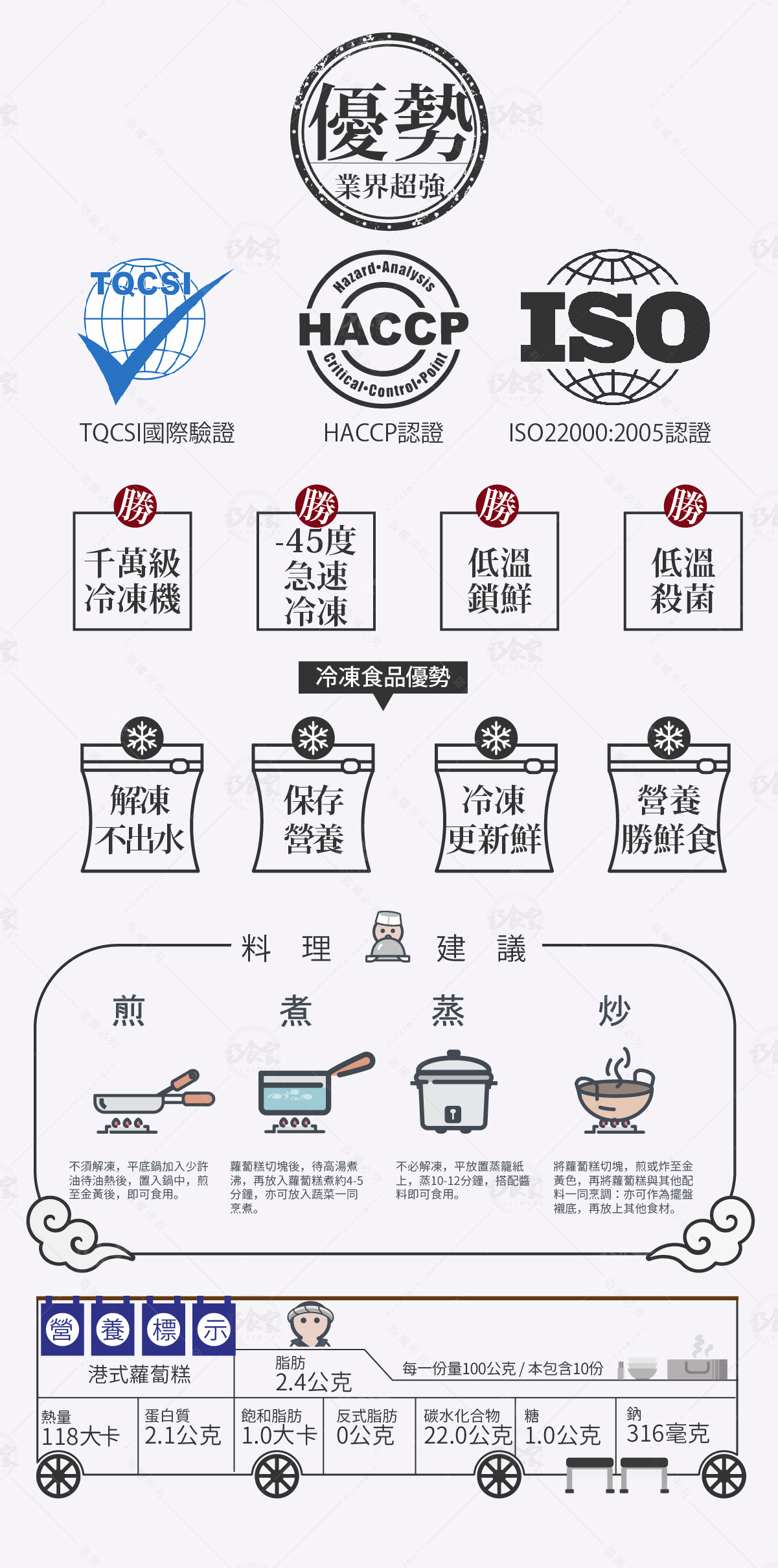 【成份】在來米粉、白蘿蔔、麵粉、大豆油、玉米澱粉(非基因改造)、糖、鹽、蝦、紅蔥頭、麥粉酥、棕櫚油、蒜頭、麥芽糊精、小麥蛋白