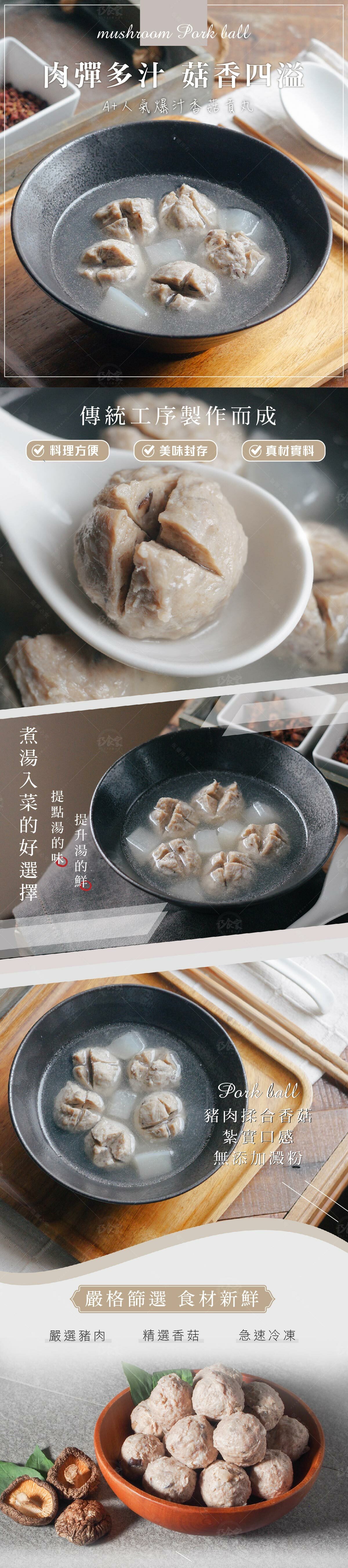 超大爆汁香菇貢丸 - 選用精選的豬肉,並經過傳統且專業的流程製作,料理時,豬肉與香菇的鮮味讓料理更鮮甜!